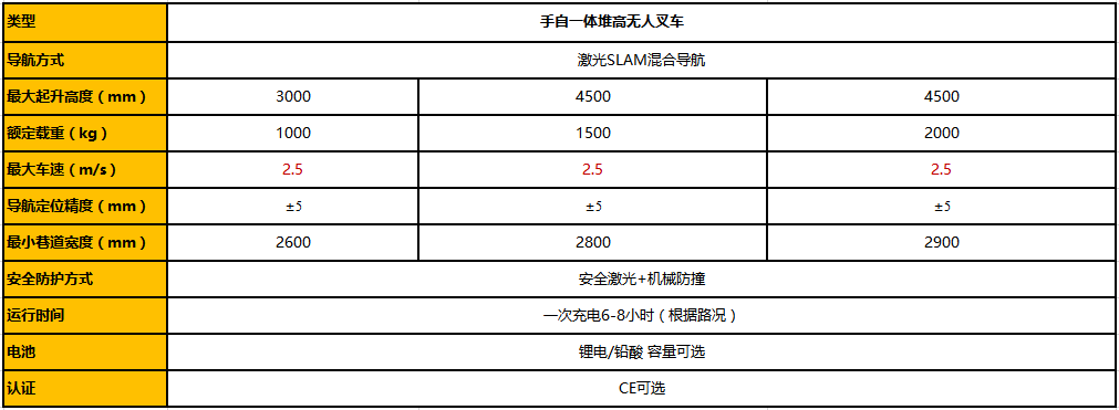 手自一體無人叉車AGV,采用激光SLAM混合導航技術及多激光360°防護技術,可舉升2000KG的貨物,較大舉升高度可達4.5m,適合于川字托盤。